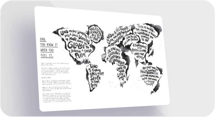 UNO. YOU KNOW IT WHEN YOU FEEL IT. There’s a different spirit and a different way of doing things at gyro. This didn’t happen by accident. Our working culture was born as a deliberate response to the changes we’re seeing around us – and the need to spark hundreds of diverse talents across the world to think and create as one. WE CALL IT UNO. UNO is made of collaboration and openness and big hearts. It is what happens when a global company takes away borders and silos and internal politics. Above all, UNO is how we ensure nothing comes between our clients and ideas that could transform their business. And the best way to understand it is through the feelings it creates. It’s not just one emotion; it’s many different feelings woven into one sense of purpose that drives this company and makes us who we are: humans at work, creating humanly relevant ideas. It’s only possible because of UNO.