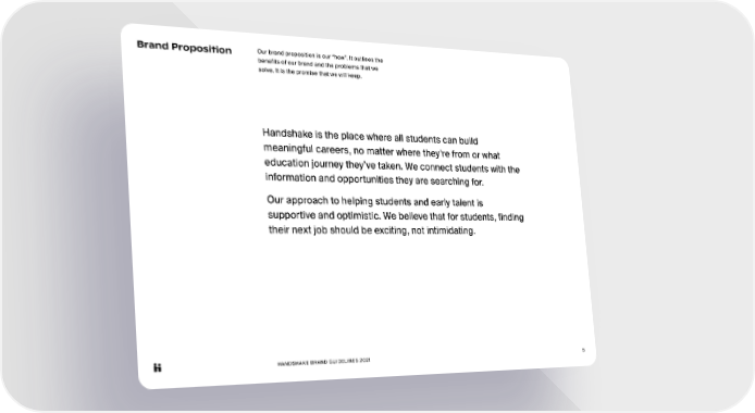 HANDSHAKE BRAND GUIDELINES 2021 5 Brand Proposition Our brand proposition is our “how”. It outlines the benefits of our brand and the problems that we solve. It is the promise that we will keep. Handshake is the place where all students can build meaningful careers, no matter where they’re from or what education journey they’ve taken. We connect students with the information and opportunities they are searching for. Our approach to helping students and early talent is supportive and optimistic. We believe that for students, finding their next job should be exciting, not intimidating.