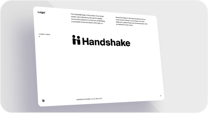 HANDSHAKE BRAND GUIDELINES 2021 18 Logo PRIMARY MARK ▶ The Handshake logo is the anchor of our brand system , and maintaining the mark’s integrity across all touchpoints is critical for establishing a successful corporate identity. The logo is a horizontal lockup of the brand wordmark and our iconic symbol. Modern and timeless, the mark balances trustworthiness and professionalism with an authentic human touch.