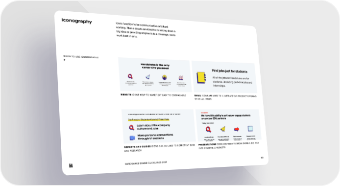 HANDSHAKE BRAND GUIDELINES 2021 60 Top Reasons Students Attended Virtual Fairs Learn about the company culture and jobs Make personal connections through 1:1 sessions To best engage students in a virtual career fair, however, will entail a bit of creativity Iconography Icons function to be communicative and hard working. These assets are ideal for breaking down a big idea or providing emphasis to a message. Icons work best in sets. WHEN TO USE ICONOGRAPHY ▶ WEBSITE ICONS HELP TO MAKE TEXT EASY TO COMPREHEND REPORTS AND GUIDES ICONS CAN BE USED TO REPRESENT DATA AND RESEARCH EMAIL ICONS ARE USED TO ILLUSTRATE OUR PRODUCT OFFERING OR VALUE PROPS PRESENTATIONS ICONS ARE USED TO BREAK DOWN A BIG IDEA INTO DIGESTIBLE NUGGETS