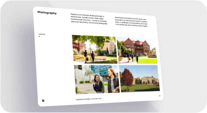 HANDSHAKE BRAND GUIDELINES 2021 52 Photography Campus or environmental photography helps to establish tone. Typically outdoor, these images should be bright and sunny — we want to showcase places that feel inviting. Environmental photography should balance architecture and with nature; trees, grass, plants, etc add texture and warmth to outdoors shots. It is preferable to include students, even if only in the background, when choosing campus imagery. CAMPUS ▶