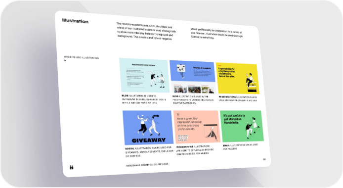 GIVEAWAY HANDSHAKE BRAND GUIDELINES 66 Illustration The monotone palette (one color, plus black and white) of our illustrated assets is used strategically to allow more interplay between foreground and background. This creates and natural negative space and flexibility in composition for a variety of use. However, illustration should be used sparingly. Context is everything. WHEN TO USE ILLUSTRATION ▶ BLOG ILLUSTATION IS USED TO REPRESENT SEVERAL DIFFERENT POSTS WITH A SIMILAR TOPIC OR IDEA SOCIAL ILLUSTRATION CAN BE USED FOR GIVEAWAYS, ANNOUNCEMENTS, EXPLAINER OR HOW-TOS BLOG ILLUSTRATION IS USED IN THE PAGE HEADERS TO EXPRESS THE VARIOUS CONTENT CATEGORIES INFOGRAPHICS ILLUSTRATIONS ARE USED TO EXPLAIN AND PROVIDE COMPREHENSION FOR AN IDEA EMAIL ILLUSTRATIONS CAN BE USED FOR HEADERS PRESENTATIONS ILLUSTRATION CAN BE USED ON PAGES TO PRESENT A BIG IDEA