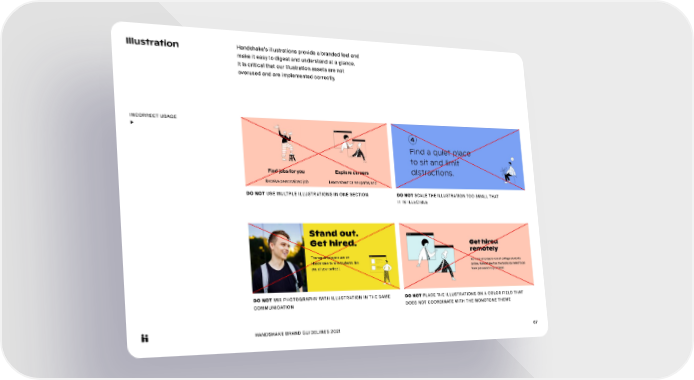 Find jobs for you Receive personalized job Explore careers Learn about career paths and HANDSHAKE BRAND GUIDELINES 2021 67 Illustration Handshake’s illustrations provide a branded feel and make it easy to digest and understand at a glance. It is critical that our illustration assets are not overused and are implemented correctly. INCORRECT USAGE ▶ DO NOT USE MULTPLE ILLUSTRATIONS IN ONE SECTION DO NOT MIX PHOTOGRAPHY WITH ILLUSTRATION IN THE SAME COMMUNICATION DO NOT SCALE THE ILLUSTRATION TOO SMALL THAT IT IS ILLEGIBLE DO NOT PLACE THE ILLUSTRATIONS ON A COLOR FIELD THAT DOES NOT COORDINATE WITH THE MONOTONE THEME Stand out. Get hired. The top employers are on Handshake to hire students like you at your school.
