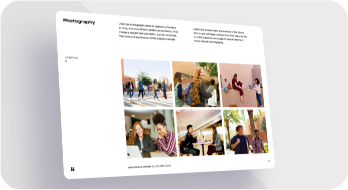 HANDSHAKE BRAND GUIDELINES 2021 51 Photography Lifestyle photography aims to capture a moment in time, and should feel candid and authentic. This imagery should feel optimistic, but not contrived. The tone and expression of the subjects should match the environment and context of the photo. Aim to use to image compositions that features two or more subjects, as groups of people tend feel more natural and engaging. LIFESTYLE ▶