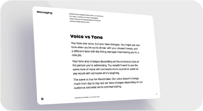 HANDSHAKE BRAND GUIDELINES 2021 10 Messaging Establishing a singular brand voice is a necessary first step in crafting our brand messaging. Determining and understanding the intended audience helps dictate tone. Voice vs Tone You have one voice, but your tone changes. You might use one tone when you’re out to dinner with your closest friends, and a different tone with the hiring manager interviewing you for a new job. Your tone also changes depending on the emotional state of the person you’re addressing. You wouldn’t want to use the same tone of voice with someone who’s scared or upset as you would with someone who’s laughing. The same is true for Handshake. Our voice doesn’t change much from day to day, but our tone changes depending on our audience and what we’re communicating.