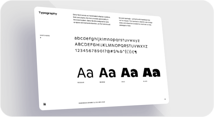 HANDSHAKE BRAND GUIDELINES 2021 34 Typography Ginto Nord serves as Handshake’s display typeface. Bold and playful, this font provides personality to the brand system. Ginto Nord is designed to take up space and demand attention, so the font should be used sparingly — primarily with headlines that call for impact. This typeface is ideal for use at large sizes, and should be avoided for small text or long passages of text. abcdefghijklmnopqrstuvwxyz ABCDEFGHIJKLMNOPQRSTUVWXYZ 1234567890!?@#$%&*{()}¢¶ Aa Aa Aa Aa GINTO NORD ▶ REGULAR MEDIUM BOLD BLACK