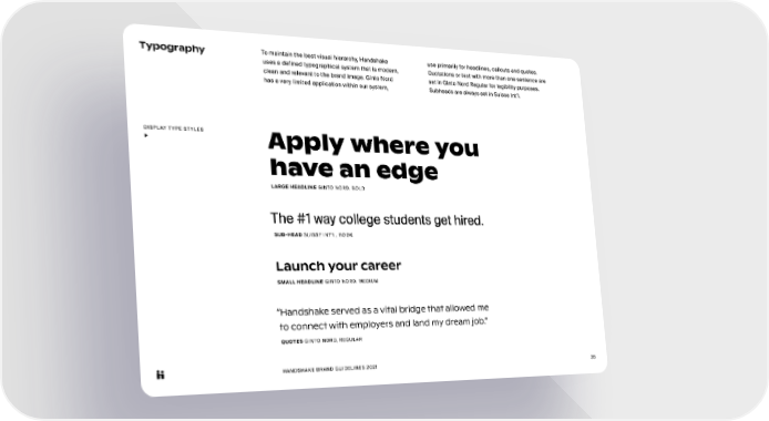 HANDSHAKE BRAND GUIDELINES 2021 35 Typography To maintain the best visual hierarchy, Handshake uses a defined typographical system that is modern, clean and relevant to the brand image. Ginto Nord has a very limited application within our system, use primarily for headlines, callouts and quotes. Quotations or text with more than one sentence are set in Ginto Nord Regular for legibility purposes. Subheads are always set in Suisse Int’l. DISPLAY TYPE STYLES ▶ Apply where you have an edge The #1 way college students get hired. Launch your career “Handshake served as a vital bridge that allowed me to connect with employers and land my dream job.” LARGE HEADLINE GINTO NORD, BOLD SUB-HEAD SUISSE INT’L, BOOK SMALL HEADLINE GINTO NORD, MEDIUM QUOTES GINTO NORD, REGULAR