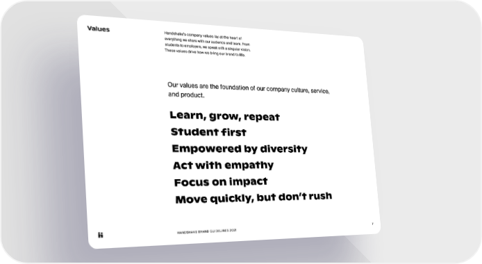 HANDSHAKE BRAND GUIDELINES 2021 7 Values Handshake’s company values lay at the heart of everything we share with our audience and team. From students to employers, we speak with a singular vision. These values drive how we bring our brand to life. Learn, grow, repeat Student first Empowered by diversity Act with empathy Focus on impact Move quickly, but don’t rush Our values are the foundation of our company culture, service, and product.