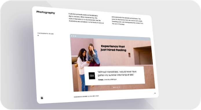 HANDSHAKE BRAND GUIDELINES 2021 53 Photography Illustration primarily exists on Handshake’s digital channels. When implementing this style of illustration, it is recommended that the illustrations are contained in a full block of color, as demonstrated in the website section below. This gives the illustrations their own section with ample breathing room, and distinguishes this content from the rest of the page. PHOTOGRAPHY IN USE ▶