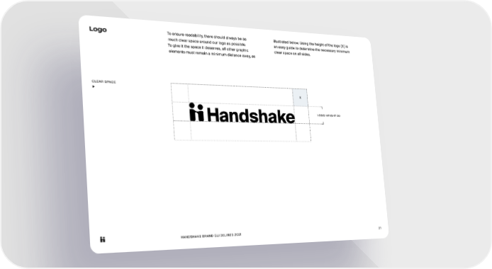 HANDSHAKE BRAND GUIDELINES 2021 21 Logo To ensure readability, there should always be as much clear space around our logo as possible. To give it the space it deserves, all other graphic elements must remain a minimum distance away, as illustrated below. Using the height of the logo [X] is an easy guide to determine the necessary minimum clear space on all sides. CLEAR SPACE ▶ X LOGO HEIGHT (X)
