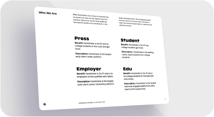 HANDSHAKE BRAND GUIDELINES 2021 6 Who We Are While Handshake’s core mission is universal, how we present our story can vary depending on our audience. Each of our brand’s three audiences have specific benefits and contributions to the larger Handshake brand. This messaging explains why each facet of our brand exists, what sets us apart, and how we uniquely help our customers and partners succeed. Press Student Employer Edu Benefit: Handshake is the #1 site for college students to find a job and get hired. Description: Handshake is the largest early talent career platform. Benefit: Handshake is the #1 way college students get hired. Description: Handshake is the leading career search platform for college students. Benefit: Handshake is the #1 place for employers to hire qualified early talent. Description: Handshake is the largest early talent career networking platform. Benefit: Handshake is the #1 place for college students to find jobs and internships. Description: Handshake is the largest and most engaged platform for early talent to find opportunity.
