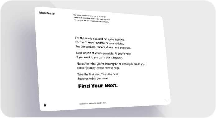 HANDSHAKE BRAND GUIDELINES 2021 4 Manifesto Our brand manifesto is our call to action for students. It describes what we do, what we stand for, and what we can help students accomplish. For the ready, set, and not quite there yet. For the “I know” and the “I have no idea.” For the seekers, finders, doers, and explorers. Look ahead at what’s possible. At what’s next. If you want it, you can make it happen. No matter what you’re looking for, or where you are in your career journey—we’re here to help. Take the first step. Then the next. Towards to job you want. Find Your Next.