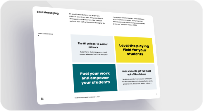 HANDSHAKE BRAND GUIDELINES 2021 14 EDU Messaging We speak to each audience in a unique tone within the larger brand voice. Always consider the demographic and environment of the intended audience while crafting Handshake messaging. Our messaging for education partners, should feel helpful, action-oriented, and inspiring. Avoid phrases that feel exclusionary. In external-facing communications, please use “education” instead of EDU. SAMPLE MESSAGING ▶ The #1 college-to-career network Supercharge student engagement and connect with more than 500K employers Fuel your work and empower your students Level the playing field for your students Help students get the most out of Handshake Handshake provides free resources to help your institution spread the word to students. Explore guides, presentations, videos, case studies, and more.