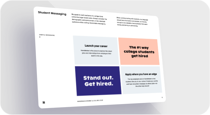 HANDSHAKE BRAND GUIDELINES 2021 13 Student Messaging We speak to each audience in a unique tone within the larger brand voice. Always consider the demographic and environment of the intended audience while crafting Handshake messaging. When communicating with students, our language should feel informative and reliable, yet friendly enough to be relatable. Avoid phrases that seem trendy, pandering or patronizing. SAMPLE MESSAGING ▶ Launch your career Handshake is the place to explore the latest jobs and internships from employers that want to hire you. Stand out. Get hired. The #1 way college students get hired Apply where you have an edge The top employers are on Handshake to hire students like you at your school. Create your profile and have recruiters message you about jobs—not the other way around!