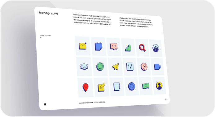 HANDSHAKE BRAND GUIDELINES 2021 57 Iconography The Handshake icon style is simple and geometric in form, and uses a hard-edge shadow offset to give the icons an extra pop of personality. Handshake icons are always one color plus the dark outline and shadow color. Additionally, these assets must be similar in size and visual complexity. Icons can be used alone to emphasize a single idea, or in sets to express several different value propositions. ICON SYSTEM ▶