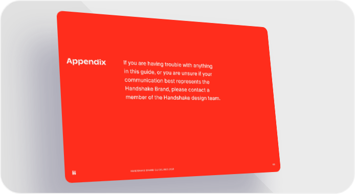HANDSHAKE BRAND GUIDELINES 2021 68 If you are having trouble with anything in this guide, or you are unsure if your communication best represents the Handshake Brand, please contact a member of the Handshake design team. HANDSHAKE BRAND GUIDELINES 2021 68 Appendix