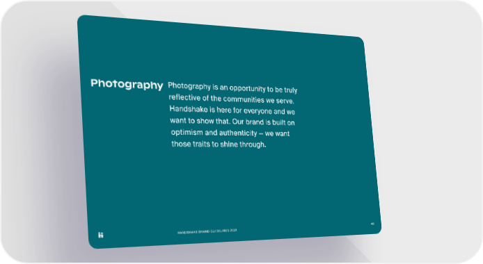 HANDSHAKE BRAND GUIDELINES 2021 48 Photography is an opportunity to be truly reflective of the communities we serve. Handshake is here for everyone and we want to show that. Our brand is built on optimism and authenticity — we want those traits to shine through. HANDSHAKE BRAND GUIDELINES 2021 48 Photography