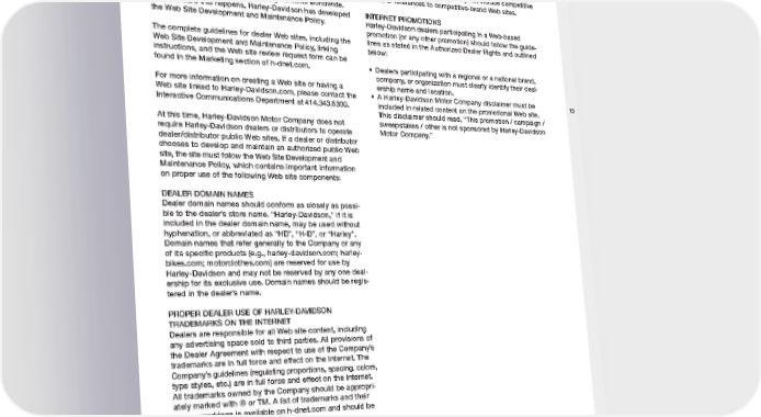 INTERNET GUIDELINES FOR DEALERS We understand that the Internet is a powerful marketing tool, NON-COMPANY PRODUCTS AND SERVICES allowing you to communicate with current and potential ON DEALER WEB SITES customers quickly and easily. It is essential, however, that Advertising or promotion of products and services on deal- the information communicated comply with our dealer and er/distributor Web sites displaying Harley-Davidson Motor distribution sales and services agreements. It must ensure Company trademarks is limited to products and services customer satisfaction and safety, and must also be consis- marketed by the Company and may not include competitive tent with our rights and obligations, copyrights, trademarks, brands or references to competitive-brand Web sites. applicable law and other business agreements worldwide. To make sure this happens, Harley-Davidson has developed INTERNET PROMOTIONS the Web Site Development and Maintenance Policy. Harley-Davidson dealers participating in a Web-based promotion (or any other promotion) should follow the guide- The complete guidelines for dealer Web sites, including the lines as stated in the Authorized Dealer Rights and outlined Web Site Development and Maintenance Policy, linking below: instructions, and the Web site review request form can be found in the Marketing section of h-dnet.com. • Dealers participating with a regional or a national brand, company, or organization must clearly identify their deal- For more information on creating a Web site or having a ership name and location. Web site linked to Harley-Davidson.com, please contact the • A Harley-Davidson Motor Company disclaimer must be Interactive Communications Department at 414.343.8300. included in related content on the promotional Web site. 13 This disclaimer should read, “This promotion / campaign / At this time, Harley-Davidson Motor Company does not sweepstakes / other is not sponsored by Harley-Davidson require Harley-Davidson dealers or distributors to operate Motor Company.” dealer/distributor public Web sites. If a dealer or distributor chooses to develop and maintain an authorized public Web site, the site must follow the Web Site Development and Maintenance Policy, which contains important information on proper use of the following Web site components: DEALER DOMAIN NAMES Dealer domain names should conform as closely as possi- ble to the dealer’s store name. “Harley-Davidson,” if it is included in the dealer domain name, may be used without hyphenation, or abbreviated as “HD”, “H-D”, or “Harley”. Domain names that refer generally to the Company or any of its specific products (e.g., harley-davidson.com; harley- bikes.com; motorclothes.com) are reserved for use by Harley-Davidson and may not be reserved by any one deal- ership for its exclusive use. Domain names should be regis- tered in the dealer’s name. PROPER DEALER USE OF HARLEY-DAVIDSON TRADEMARKS ON THE INTERNET Dealers are responsible for all Web site content, including any advertising space sold to third parties. All provisions of the Dealer Agreement with respect to use of the Company’s trademarks are in full force and effect on the Internet. The Company’s guidelines (regulating proportions, spacing, colors, type styles, etc.) are in full force and effect on the Internet. All trademarks owned by the Company should be appropri- ately marked with ® or TM. A list of trademarks and their proper markings is available on h-dnet.com and should be passed on to the Web site administrator.