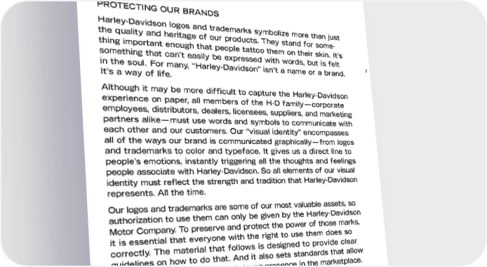 PROTECTING OUR BRANDS Harley-Davidson logos and trademarks symbolize more than just the quality and heritage of our products. They stand for some- thing important enough that people tattoo them on their skin. It’s something that can’t easily be expressed with words, but is felt in the soul. For many, “Harley-Davidson” isn’t a name or a brand. 3 It’s a way of life. Although it may be more difficult to capture the Harley-Davidson experience on paper, all members of the H-D family—corporate employees, distributors, dealers, licensees, suppliers, and marketing partners alike—must use words and symbols to communicate with each other and our customers. Our “visual identity” encompasses all of the ways our brand is communicated graphically—from logos and trademarks to color and typeface. It gives us a direct line to people’s emotions, instantly triggering all the thoughts and feelings people associate with Harley-Davidson.So all elements of our visual identity must reflect the strength and tradition that Harley-Davidson represents. All the time. Our logos and trademarks are some of our most valuable assets, so authorization to use them can only be given by the Harley-Davidson Motor Company.To preserve and protect the power of those marks, it is essential that everyone with the right to use them does so correctly. The material that follows is designed to provide clear guidelines on how to do that. And it also sets standards that allow us to maintain a consistent and strong presence in the marketplace. If you are about to use the Harley-Davidson name, trademarks, or logos you should confirm with your Harley-Davidson Motor Company contact that you are an authorized user. You are in the unique position to protect and build the Harley-Davidson brand, and to ensure its legacy lives on. So embrace this opportunity. Take pride in it. And uphold what Harley-Davidson is all about.