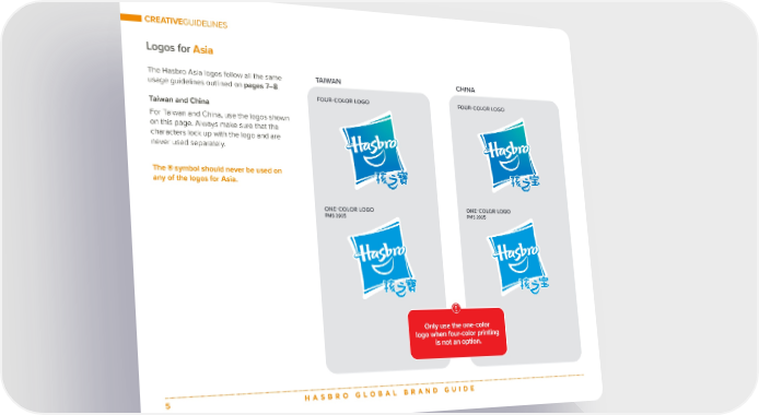 CREATIVEGUIDELINES Logos for Asia The Hasbro Asia logos follow all the same TAIWAN CHINA usage guidelines outlined on pages 7–8. FOUR-COLOR LOGO FOUR-COLOR LOGO Taiwan and China For Taiwan and China, use the logos shown on this page. Always make sure that the characters lock up with the logo and are never used separately. The symbol should never be used on any of the logos for Asia. ONE-COLOR LOGO ONE-COLOR LOGO PMS 2925 PMS 2925 Only use the one-color logo when four-color printing is not an option. 5 HASBRO GLOBAL BRAND GUIDE