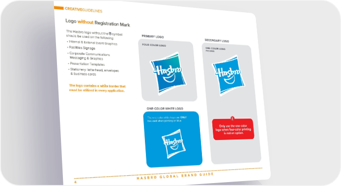 CREATIVEGUIDELINES Logo without Registration Mark The Hasbro logo without the symbol PRIMARY LOGO SECONDARY LOGO should be used on the following: • I nternal & Extenal Event Graphics FOUR-COLOR LOGO ONE-COLOR LOGO PMS 2925 • Facilities Signage • C orporate Communications Messaging & Graphics • P resentation Templates • S tationery: letterhead, envelopes & business cards The logo contains a white border that must be utilized in every application. ONE-COLOR WHITE LOGO The one-color white logo can ONLY be used when printing on blue. Only use the one-color logo when four-color printing is not an option. 4 HASBRO GLOBAL BRAND GUIDE