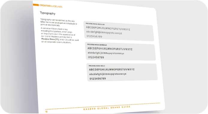 CREATIVEGUIDELINES Typography Typography can be defined as the way PROXIMA NOVA REGULAR letter forms are arranged and displayed in print or electronically. ABCDEFGHIJKLMNOPQRSTUVWXYZ A consistent brand look is key, abcdefghijklmnopqrstuvwxyz including the typeface, which plays an important role in the appearance of 0123456789 our brand. Hasbro’s primary font is Proxima Nova (TT), which should be used on all corporate communications. PROXIMA NOVA SEMIBOLD ABCDEFGHIJKLMNOPQRSTUVWXYZ abcdefghijklmnopqrstuvwxyz 0123456789 PROXIMA NOVA BOLD ABCDEFGHIJKLMNOPQRSTUVWXYZ abcdefghijklmnopqrstuvwxyz 0123456789 12 HASBRO GLOBAL BRAND GUIDE