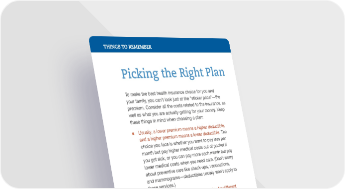 THINGS TO REMEMBER Picking the Right Plan To make the best health insurance choice for you and your family, you can’t look just at the “sticker price”—the premium. Consider all the costs related to the insurance, as well as what you are actually getting for your money. Keep these things in mind when choosing a plan: „ Usually, a lower premium means a higher deductible, and a higher premium means a lower deductible. The choice you face is whether you want to pay less per month but pay higher medical costs out of pocket if you get sick, or you can pay more each month but pay lower medical costs when you need care. (Don’t worry about preventive care like check-ups, vaccinations, and mammograms—deductibles usually won’t apply to these services.) „ Some plans have separate deductibles for different services. For example, a plan might have one deductible for medications and a separate deductible for other services. „ Remember that there may also be differences in copayments and co-insurance that you should consider. However, these likely won’t apply to preventive care. „ Don’t assume that deductibles and copayments or co-insurance are the only differences between plans– even when plans are offered by the same company with similar names. Be sure to check whether all the same health services are covered, and be aware of any
