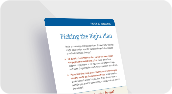 THINGS TO REMEMBER Picking the Right PlanPicking the Right Plan limits on coverage of these services. (For example, the plan might cover only a speci昀椀c number of days in the hospital or visits to physical therapy.) „ Be sure to check that the plan covers the prescription drugs you take and at what price. Many plans have different copayments or co-insurance for different drugs, and some drugs may be much more expensive than others. „ Remember that most plans have provider networks you need to use to get the lowest-cost care. Make sure the plan’s network works for you. And if you already have a provider you want to keep seeing, make sure she is part of the network. Where can I 昀椀nd a plan for me? Enrollment in coverage for 2017 runs from November 1, 2016, through January 31, 2017. You can shop for an affordable health insurance plan and apply for 昀椀nancial assistance to help pay for the plan you choose. In fact, most people receive 昀椀nancial assistance. You can sign up any time during the year if you experience a major life change like getting married, having a baby, or losing your job. And don’t forget that Medicaid enrollment is open year-round. Go to www.healthcare.gov to connect to your state’s marketplace. You can also call 1-800-318-2596. Local, in-person assistance is available to help you sign up, just call 1-800-318-2596 or go to localhelp.healthcare.gov.