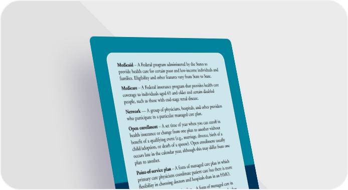 Medicaid – A Federal program administered by the States to provide health care for certain poor and low-income individuals and families. Eligibility and other features vary from State to State. Medicare – A Federal insurance program that provides health care coverage to individuals aged 65 and older and certain disabled people, such as those with end-stage renal disease. Network — A group of physicians, hospitals, and other providers who participate in a particular managed care plan. Open enrollment – A set time of year when you can enroll in health insurance or change from one plan to another without benefit of a qualifying event (e.g., marriage, divorce, birth of a child/adoption, or death of a spouse). Open enrollment usually occurs late in the calendar year, although this may differ from one plan to another. Point-of-service plan – A form of managed care plan in which primary care physicians coordinate patient care but there is more flexibility in choosing doctors and hospitals than in an HMO. Preferred provider organization – A form of managed care in which you have more flexibility in choosing physicians and other providers than in an HMO. You can see both participating and nonparticipating providers, but your out-of-pocket expenses will be lower if you see only plan providers. Premium – The amount you pay to belong to a health plan. If you have employer-sponsored health insurance, your share of premiums usually are deducted from your pay. Primary care physician – Usually a family practice doctor, internist, obstetrician-gynecologist, or pediatrician. He or she is your first point of contact with the health care system, particularly if you are in a managed care plan. Reasonable and customary charge – The prevailing cost of a medical service in a given geographic area. 28