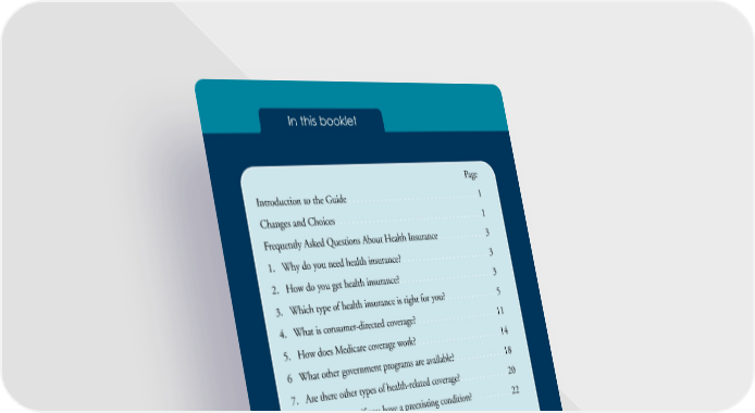 In this booklet Page Introduction to the Guide . . . . . . . . . . . . . . . . . . . . . . . . . . . . . . . . . . 1 Changes and Choices. . . . . . . . . . . . . . . . . . . . . . . . . . . . . . . . . . . . . . 1 Frequently Asked Questions About Health Insurance. . . . . . . . . . . . . 3 1. Why do you need health insurance? . . . . . . . . . . . . . . . . . . . . . . . 3 2. How do you get health insurance?. . . . . . . . . . . . . . . . . . . . . . . . . 3 3. Which type of health insurance is right for you?. . . . . . . . . . . . . . 5 4. What is consumer-directed coverage? . . . . . . . . . . . . . . . . . . . . . 11 5. How does Medicare coverage work? . . . . . . . . . . . . . . . . . . . . . . 14 6 What other government programs are available? . . . . . . . . . . . . . 18 7. Are there other types of health-related coverage?. . . . . . . . . . . . . 20 8. What happens if you have a preexisting condition? . . . . . . . . . . 22 9. What happens if you have health insurance through your employer and you leave your job?. . . . . . . . . . . . . . . . . . . . . . . . 23 In Closing . . . . . . . . . . . . . . . . . . . . . . . . . . . . . . . . . . . . . . . . . . . . . 25 Glossary . . . . . . . . . . . . . . . . . . . . . . . . . . . . . . . . . . . . . . . . . . . . . . . 26 Resources for More Information . . . . . . . . . . . . . . . . . . . . . . . . . . . . 29