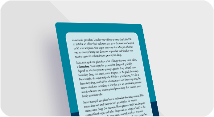 in-network providers. Usually, you will pay a copay (typically $10 to $20 for an office visit) each time you go to the doctor or hospital or fill a prescription. Your copay may vary depending on whether you see your primary care doctor or a specialist and whether you receive a generic or brand name prescription drug. Most managed care plans have a list of drugs that they cover, called a formulary. Your copay for prescription drugs will probably depend on whether you are getting a generic drug, a brand name formulary drug, or a brand name drug not on the plan’s formulary. For example, the copay might be $10 for a generic drug, $25 for a formulary drug, and $40 for a brand name non-formulary drug. Be sure to check the formulary of the plan you are considering to make sure it will cover any routine prescription drugs that you and your family members take. Some managed care plans have a mail-order pharmacy option. This means that you send your doctor’s prescription for routine maintenance drugs (for example, blood pressure medicine, drugs to control blood sugar, and other drugs used on a regular basis) to the mail order pharmacy. In most cases, you will receive a 3-month supply of your medication by return mail. You still pay a copay, but your cost may be lower than it would be at a local retail pharmacy. If you choose to enroll in a managed care plan instead of an indemnity plan, you may have lower out-of-pocket expenses for health care, as long as you see doctors who are part of the plan (in- network providers). There are three main types of managed care plans: • Health maintenance organizations (HMOs). • Preferred provider organizations (PPOs). • Point-of-service plans (POS). All three types of managed care plans have contracts with doctors, oviders. They have agreed on certain fees hospitals, and other pr with these providers. As long as you get your care from a plan 8