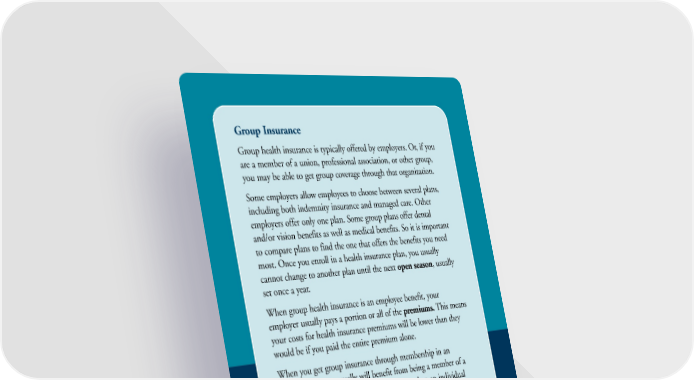 Group Insurance Group health insurance is typically offered by employers. Or, if you are a member of a union, professional association, or other group, you may be able to get group coverage through that organization. Some employers allow employees to choose between several plans, including both indemnity insurance and managed care. Other employers offer only one plan. Some group plans offer dental and/or vision benefits as well as medical benefits. So it is important to compare plans to find the one that offers the benefits you need most. Once you enroll in a health insurance plan, you usually cannot change to another plan until the next open season, usually set once a year. When group health insurance is an employee benefit, your employer usually pays a portion or all of the premiums. This means your costs for health insurance premiums will be lower than they would be if you paid the entire premium alone. When you get group insurance through membership in an organization, you usually will benefit from being a member of a large group. You may pay less for premiums than an individual would pay. However, the organization often does not pay a share of the premium, meaning you may be responsible for paying the entire premium yourself. Individual Insurance If you are self-employed or your employer does not offer health insurance, you may not have access to group insurance. You may, however, be able to purchase individual coverage directly from an insurance company. When you buy your own health insurance, you will be responsible for paying the entire premium rather than sharing the cost with an employer. You should shop around to find a plan that fits your needs at a price that you are willing to pay. 4