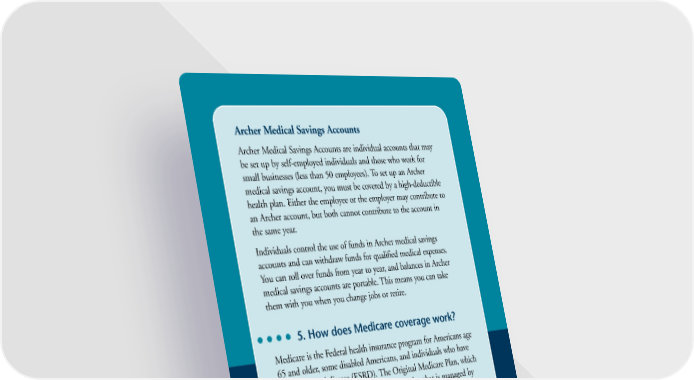 Archer Medical Savings Accounts Archer Medical Savings Accounts are individual accounts that may be set up by self-employed individuals and those who work for small businesses (less than 50 employees). To set up an Archer medical savings account, you must be covered by a high-deductible health plan. Either the employee or the employer may contribute to an Archer account, but both cannot contribute to the account in the same year. Individuals control the use of funds in Archer medical savings accounts and can withdraw funds for qualified medical expenses. You can roll over funds from year to year, and balances in Archer medical savings accounts are portable. This means you can take them with you when you change jobs or retire. 5. How does Medicare coverage work? Medicare is the Federal health insurance program for Americans age 65 and older, some disabled Americans, and individuals who have end-stage renal disease (ESRD). The Original Medicare Plan, which is available nationwide, is a fee-for-service plan that is managed by the Federal Government. It pays for many health care services and supplies, but it won’t pay all of your health care costs. Generally, you should enroll in Medicare when you first become eligible. If you choose to enroll at a later time, you will pay a late- enrollment penalty. If you already have health insurance from an employer or another source, talk to your benefits administrator about whether you should join Medicare or not while still covered. Medicare has four parts: hospital insurance, known as Part A; medical insurance, known as Part B, which provides payments for doctors and related services; and prescription drug coverage, known as Part D. Medicare Part C gives you the choice of receiving the benefits of Medicare A, B, and D through a private health plan, like 14