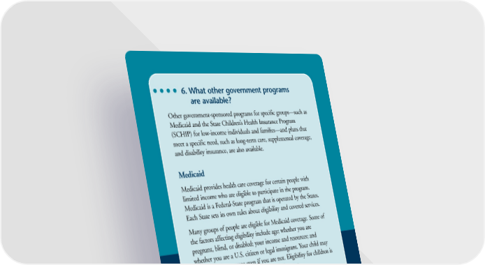6. What other government programs are available? Other government-sponsored programs for specific groups—such as Medicaid and the State Children’s Health Insurance Program (SCHIP) for low-income individuals and families—and plans that meet a specific need, such as long-term care, supplemental coverage, and disability insurance, are also available. Medicaid Medicaid provides health care coverage for certain people with limited income who are eligible to participate in the program. Medicaid is a Federal-State program that is operated by the States. Each State sets its own rules about eligibility and covered services. Many groups of people are eligible for Medicaid coverage. Some of the factors affecting eligibility include age; whether you are pregnant, blind, or disabled; your income and resources; and whether you are a U.S. citizen or legal immigrant. Your child may be eligible for coverage even if you are not. Eligibility for children is based on the child’s status, not the parent’s status. If your income is limited and you can’t afford the care you need, you should apply for Medicaid whether or not you think you qualify. A qualified caseworker in your State will evaluate your situation to see if you are eligible for Medicaid. For more information about the Medicaid program, go to www.cms.hhs.gov/MedicaidGenInfo. State Children’s Health Insurance Program Congress created the State Children’s Health Insurance Program (SCHIP) in 1997. SCHIP is a Federal/State partnership similar to Medicaid. SCHIP expanded health insurance to children whose families earn too much money to be eligible for Medicaid but not enough to purchase private insurance. 18