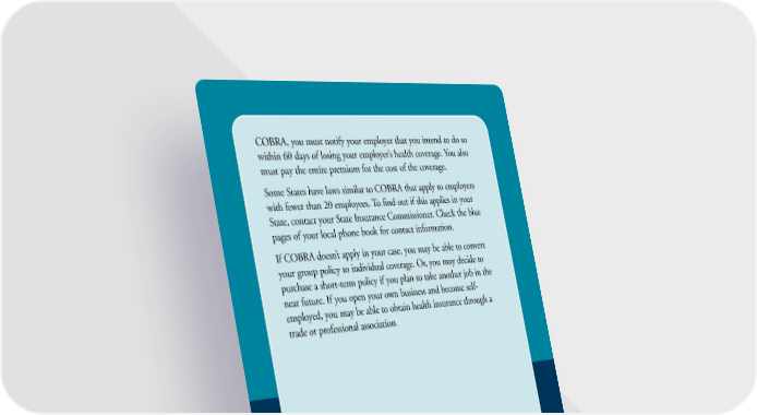 COBRA, you must notify your employer that you intend to do so within 60 days of losing your employer’s health coverage. You also must pay the entire premium for the cost of the coverage. Some States have laws similar to COBRA that apply to employers with fewer than 20 employees. To find out if this applies in your State, contact your State Insurance Commissioner. Check the blue pages of your local phone book for contact information. If COBRA doesn’t apply in your case, you may be able to convert your group policy to individual coverage. Or, you may decide to purchase a short-term policy if you plan to take another job in the near future. If you open your own business and become self- employed, you may be able to obtain health insurance through a trade or professional association. 24