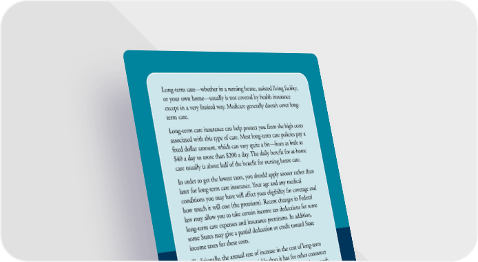 Long-term care—whether in a nursing home, assisted living facility, or your own home—usually is not covered by health insurance except in a very limited way. Medicare generally doesn’t cover long- term care. Long-term care insurance can help protect you from the high costs associated with this type of care. Most long-term care policies pay a fixed dollar amount, which can vary quite a bit—from as little as $40 a day to more than $200 a day. The daily benefit for at-home care usually is about half of the benefit for nursing home care. In order to get the lowest rates, you should apply sooner rather than later for long-term care insurance. Your age and any medical conditions you may have will affect your eligibility for coverage and how much it will cost (the premium). Recent changes in Federal law may allow you to take certain income tax deductions for some long-term care expenses and insurance premiums. In addition, some States may give a partial deduction or credit toward State income taxes for these costs. Traditionally, the annual rate of increase in the cost of long-term care services has risen more quickly than it has for other consumer services. This means the benefit you buy today may not be enough to cover higher costs in the future. You can choose a plan with an inflation adjustment feature so that you can be protected against the rise in long-term care costs over time until services are needed. Long-term care insurance may be offered where you work, or you may be eligible through a union, fraternal group, or other organization to which you belong. In addition, many life insurance companies offer long-term care insurance directly to the consumer. Disability Insurance Disability insurance replaces income you lose if you have a long- term illness or injury and cannot work. This is an important type of coverage for working-age people to consider. 21