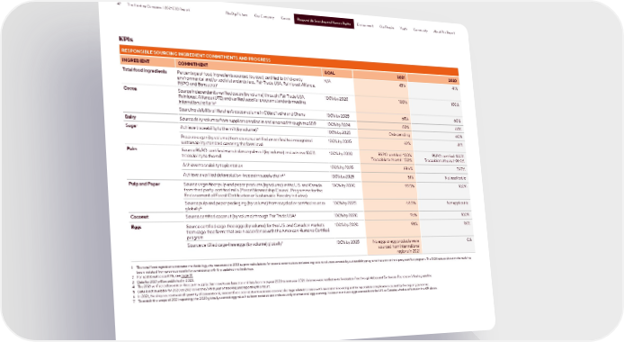 47 The Hershey Company | 2021 ESG Report Responsible Sourcing and Human Rights The Big Picture Our Company Cocoa Responsible Sourcing and Human Rights Environment Our People Youth Community About This Report KPIs RESPONSIBLE SOURCING INGREDIENT COMMITMENTS AND PROGRESS INGREDIENT COMMITMENT GOAL 2021 2020 Total food ingredients Percentage of food ingredients sourced (by cost) certified to third-party N/A 43% 41% environmental and/or social standards (e.g., Fair Trade USA, Rainforest Alliance, RSPO and Bonsucro)1 Cocoa Source independently verified cocoa (by volume) through: Fair Trade USA, 100% by 2020 100% 100% Rainforest Alliance (UTZ) and verified supplier program standards meeting 2 international criteria Sourcing visibility of Hershey’s cocoa volume in Côte d’Ivoire and Ghana 100% by 2025 68% 60% Dairy Source dairy volumes from suppliers enrolled in and assessed through the SDP 100% by 2024 80% 68% 3 100% by 2025 Data pending 60% Sugar Achieve traceability to the mill (by volume) Procure sugar (by volume) from sources certified or verified to a recognized 100% by 2025 62% 41% sustainability standard covering the farm level Palm Source RSPO-certified mass balance palm oil (by volume) and achieve 100% 100% by 2020 RSPO-certified: 100% RSPO-certified: 100% traceability to the mill Traceable to the mill: 100% Traceable to the mill: 99.8% Achieve traceability to plantation 100% by 2025 83.6% 72.7% Achieve a verified deforestation-free palm supply chain4,5 100% by 2025 51% Not applicable Pulp and Paper Source virgin fiber pulp and paper products (by volume) in the U.S. and Canada 100% by 2020 99.5% 100% from third party-certified mills (Forest Stewardship Council, Programme for the Endorsement of Forest Certification or Sustainable Forestry Initiative) Source pulp and paper packaging (by volume) from recycled or certified sources 100% by 2025 68.5% Not applicable globally5 6 100% by 2020 96% 100% Coconut Source certified coconut (by volume) through Fair Trade USA Eggs Source certified cage-free eggs (by volume) for the U.S. and Canadian markets 100% by 2020 93% 98% from cage-free farms that are in accordance with the American Humane Certified program 7 100% by 2025 No eggs or egg products were 0% Source certified cage-free eggs (by volume) globally sourced from international regions in 2021 1 The total food ingredients indicator methodology was reassessed in 2021 as prior calculations for several commodities included ingredient volumes covered by sustainability programs that are not third-party certified programs. The 2020 data as shown in this table has been restated from previous results for consistency with the updated methodology. 2 For additional cocoa KPIs, see page 31. 3 Data for 2021 will be published in 2023. 4 The 2021 verified deforestation-free palm supply chain results are based on mill lists from mid-year 2020 to mid-year 2021. Volumes were verified as deforestation-free through Airbus and Earthworm Foundation’s Starling satellite. 5 Data is not available for 2020 as 2021 is Hershey’s first year of tracking and reporting this result. 6 In 2021, Hershey sourced a small quantity of conventional, noncertified coconut due to a severe coconut shortage related to issues with raw material sourcing and transportation complications caused by the ongoing pandemic. 7 To match the scope of 2021 reporting, the 2020 globally sourced egg value has been restated and includes only international egg sourcing. It does not include eggs sourced from the U.S. or Canada, which is reflected in the KPI above.