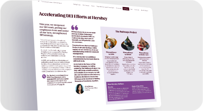 67 The Hershey Company | 2021 ESG Report The Big Picture Our Company Cocoa Responsible Sourcing and Human Rights Environment Our People Youth Community About This Report Our People Accelerating DEI Efforts at Hershey This year, we deepened our DEI work, putting our The Pathways Project employees front and center DEI has always been on our radar of our new, strengthened and top of mind. Following a DEI strategy. particularly traumatic 2020, we realized the time had come to To have the right impact, in the right way, intensify our DEI priorities and we have listened intently to our employees, do even more. using their experiences to explore ways to be I’m proud to see that our Pathways a company that truly advances inclusion in our Project is already having a visible business and our communities. As a result, together with a diverse group impact on our workforce, from our of employees, we co-created The Pathways manufacturing centers to corporate More pathways More pathways More pathways Project, our five-year plan to make our management. to JOIN: to GROW: to REACH OUT: workplace and communities even more It’s a strong start on ambitious Bringing in a wider range Recognizing and Showing up for consumers inclusive. commitments but we know there is of talent and perspectives developing talent that and communities in In 2021, we intensified our DEI priorities and still work to do. Supported by new was underrepresented new ways realized how much more we could and should hiring practices for 50% in the past Supported by seeking to be doing. We accelerated our commitments As we look to the future of The diverse slates of candidates Supported by unconscious improve access to education and recognized the need to pause, engage with Hershey Company, we will be and interviewers, expanded bias training, promoting for POC communities employees and strengthen Hershey’s inclusion guided by The Pathways Project. Not opportunities for remote diverse mentorship through new partnerships, strategy to truly embed DEI into the company — only will it help us hold ourselves hires and remote work, and commercial leader supporting BRG making it real and actionable every day. and new efforts to development to retain membership and engaging accountable to our targets, we will engage more diverse and promote in volunteering and giving Per Hershey’s commitment in our also use it to inform each and every suppliers. POC talent. opportunities. 2022 Proxy Statement, we’ve business decision to ensure that expanded DEI and human capital DEI stays at the forefront of Making disclosures in this report. For a Moments of Goodness, together. summary of our goals and KPIs related to our people, see page 74. How Hershey Defines Alicia Petross, Diversity: People of Color (POC): Chief Diversity Officer, Hershey defines diversity as dimensions Refers to Black, African American, Hershey of difference between people. These Hispanic/Latino, Asian/Asian Pacific dimensions are often referred to in terms Islander, Hawaiian Pacific Islander and of race and gender, but at Hershey, we those who identify as two or more races. also include dimensions such as age, ethnicity, sexual orientation, veteran status, physical abilities, etc.