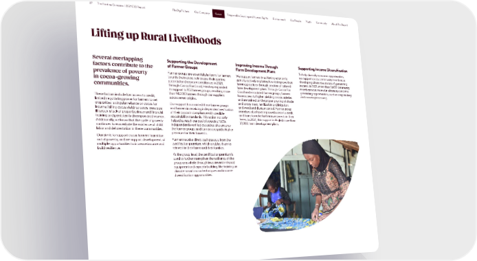 27 The Hershey Company | 2021 ESG Report Cocoa The Big Picture Our Company Cocoa Responsible Sourcing and Human Rights Environment Our People Youth Community About This Report Lifting up Rural Livelihoods Several overlapping Supporting the Development Improving Income Through Supporting Income Diversification factors contribute to the of Farmer Groups Farm Development Plans To help diversify economic opportunities, prevalence of poverty Farmer groups are essential platforms for farmers We support farmers in achieving economic we support cocoa community members in in cocoa-growing to unify their voices to increase their earning gains by actively exploring how to improve their developing alternative means of generating potential and economic resilience. In 2021, farming practices through creation of tailored income. In 2021, more than 2,600 community communities. through Cocoa For Good, Hershey expanded farm development plans. Through Cocoa For members were trained in alternative income- its support to 102 farmer groups, reaching more Good and associated farmer groups, farmers generating opportunities, such as soap making than 94,300 farmers through our suppliers have access to higher-yielding cocoa varieties and cassava processing. These factors include low access to credit, across seven origins. and are trained on the proper pruning of shade limited negotiating power for farmers to set and cocoa trees, fertilization and irrigation, crop prices, a singular reliance on cocoa for Our support has assisted these farmer groups and weed and disease control. Farmer group income, falling cocoa yields as cocoa trees age, and farmers in receiving independent verification members also have improved access to credit illiteracy, a lack of proper business and financial of their cocoa in compliance with credible and loans to make further investments in their training and persistently disempowered women. sustainability standards. This action not only farms. In 2021, this support included more than Additionally, we know that the cycle of poverty helped us reach our goal of sourcing 100% 31,000 farm development plans. continues to exacerbate the existence of child independently verified cocoa but also ensures labor and deforestation in these communities. the farmer groups and farmers are paid a higher Our aim is to support cocoa farmers’ transition premium for their harvests. out of poverty, and we support development of Farmers receive direct cash payouts from the multiple opportunities to increase income and certification premium, which enables them to build resilience. reinvest in their farms and their families. At the group level, the certification premium is used to further strengthen the resiliency of the group as a whole through investment in shared equipment and capacity building, like training on climate-smart cocoa techniques and income- diversification opportunities.