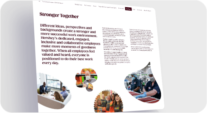63 The Hershey Company | 2021 ESG Report The Big Picture Our Company Cocoa Responsible Sourcing and Human Rights Environment Our People Youth Community About This Report Our People Stronger Together Different ideas, perspectives and Much like the previous year, 2021 was a Our most recent 2021 employee satisfaction year of unexpected challenges. While we survey showed that employees remain highly could not control all the stressors impacting engaged and fulfilled, although, consistent with backgrounds create a stronger and our employees, we took decisive steps to marketplace trends, these metrics declined safeguard our people’s physical, emotional slightly from 2020 due to effects of a prolonged more successful work environment. and financial well-being. pandemic. Despite the slight decrease, we Hershey is deeply focused on enhancing achieved greater than 75% favorability on Hershey’s dedicated, engaged, diversity, equity and inclusion, investing both key metrics in 2021. We are increasing in well-being, helping people grow and transparency of workforce and well-being data inclusive and collaborative employees delivering excellence. We are committed to and insights to transform the way we lead. the programmatic development of our people, We are committed to providing unique make more moments of goodness including future-facing commercial skills, Hershey opportunities that infuse energy and leadership and career development. excitement into the employee experience. together. When all employees feel We continue to support employees’ careers and connections through engagement with valued and heard, everyone is managers, mentors and sponsors, as well as through the adaptation and expansion of our positioned to do their best work benefits. Flexibility and care systems are key to employee well-being and mental health. We are every day. designing and reinvigorating policies to improve our flexible approach.