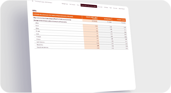 46 The Hershey Company | 2021 ESG Report Responsible Sourcing and Human Rights The Big Picture Our Company Cocoa Responsible Sourcing and Human Rights Environment Our People Youth Community About This Report KPIs SUPPLIER PROGRAM 2021 TOP NONCOMPLIANCE ISSUE CATEGORIES HEALTH, SAFETY AND ENVIRONMENT WORKING HOURS HYGIENE Major noncompliance issue category (# and % of total noncompliances) 397 (55.2%) 75 (10.4%) 73 (10.2%) Average number of noncompliance issues per audit by location Africa 0.63 0.00 0.25 Brazil 1.81 0.40 0.13 China 1.86 0.11 0.82 Europe 1.71 0.29 0.00 India 1.33 0.33 0.00 Malaysia 2.71 0.47 0.47 Mexico 1.63 0.74 0.26 North America 0.84 0.07 0.07 Rest of Asia 2.40 0.36 0.36 Rest of Latin America 0.00 0.00 0.00