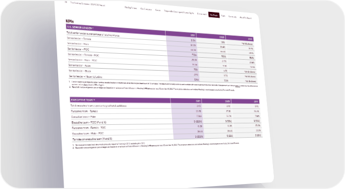 78 The Hershey Company | 2021 ESG Report The Big Picture Our Company Cocoa Responsible Sourcing and Human Rights Environment Our People Youth Community About This Report Our People KPIs 1,2 U.S. SENIOR LEADER 2021 2020 2019 Total senior leader as percentage of total workforce 2.0% 1.8% Not disclosed Senior leader – Female 32.0% 33.4% 31.9% Senior leader – Male 68.0% 66.6% 68.1% Senior leader – POC 17.0% 13.5% 14.4% Senior leader – Female – POC 25.3% 21.7% 22.4% Senior leader – Male – POC 13.0% 9.3% 10.6% Senior leader – Asian 7.5% 6.1% Not disclosed Senior leader – Black 2.9% 3.7% Not disclosed Senior leader – Hispanic/Latino 5.9% 3.3% Not disclosed 1 Senior leader level data includes Hershey people leaders or employees at an internal pay band level of 3B or higher. This data is not mutually exclusive and overlaps with some headcount also included in the Management level data on page 77, which includes employees at an internal pay band level of 2B or higher. 2 Race/ethnicity and gender percentages are based on employee self-identification in Hershey’s HR data system as of December 31, 2021. This employee data does not include Hershey’s recent acquisitions of Lily’s, Dot’s and Pretzels. 3,4 EXECUTIVE TEAM 2021 2020 2019 Total executive team as percentage of total workforce 0.1% 0.1% 0.1% Executive team – Female 22.2% 27.3% 28.6% Executive team – Male 77.8% 72.7% 71.4% Executive team – POC (# and %) 2 (22.2%) 3 (33%) 3 (33%) Executive team - Female - POC 0.0% 0.0% 25.0% Executive team - Male - POC 28.6% 28.6% 22.2% Females on executive team (# and %) 2 (22.2%) 2 (22%) 2 (22%) 3 The executive team includes employees who report to Hershey’s CEO, including the CEO. 4 Race/ethnicity and gender percentages are based on employee self-identification in Hershey’s HR data system as of December 31, 2021. This employee data does not include Hershey’s recent acquisitions of Lily’s, Dot’s and Pretzels.