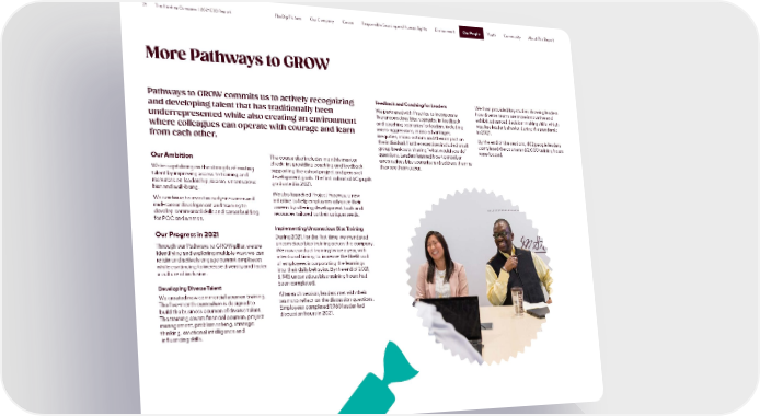 71 The Hershey Company | 2021 ESG Report The Big Picture Our Company Cocoa Responsible Sourcing and Human Rights Environment Our People Youth Community About This Report Our People More Pathways to GROW Pathways to GROW commits us to actively recognizing Feedback and Coaching for Leaders We then provided key studies showing leaders and developing talent that has traditionally been We partnered with Practica to incorporate how diverse teams are more innovative and five unconscious bias scenarios in feedback exhibit advanced decision-making skills, which underrepresented while also creating an environment and coaching scenarios for leaders, including was key leader behavior during the pandemic where colleagues can operate with courage and learn micro-aggressions, micro-advantages, in 2021. from each other. inequities, micro-actions and their impact on By the end of the sessions, 402 people leaders the individual. Further exercises included small completed the course and 2,000 training hours group breakouts sharing “what would you do” were logged. questions. Leaders learned how to monitor Our Ambition The course also includes monthly mentor unconscious bias scenarios and address them as check-ins providing coaching and feedback they see them occur. We’re capitalizing on the strength of existing supporting the cohort project and personal talent by improving access to training and development goals. The first cohort of 60 pupils resources on leadership, racism, unconscious graduated in 2021. bias and well-being. We also launched Project Freeway, a new We continue to invest in early-in-career and initiative to help employees advance their mid-career development and training to careers by offering development tools and develop commercial skills and career building resources tailored to their unique needs. for POC and women. Implementing Unconscious Bias Training Our Progress in 2021 During 2021, for the first time, we mandated Through our Pathways to GROW pillar, we are unconscious bias training across the company. identifying and exploring multiple ways we can We now conduct training twice a year, with retain and actively engage current employees intentional timing to increase the likelihood while continuing to increase diversity and foster of employees incorporating the learnings a culture of inclusion. into their daily behavior. By the end of 2021, 6,943 unconscious bias training hours had Developing Diverse Talent been completed. We created new commercial acumen training. After each session, leaders met with their The five-month curriculum is designed to teams to reflect on the discussion questions. build the business acumen of diverse talent. Employees completed 1,960 leader-led The training covers financial acumen, project discussion hours in 2021. management, problem solving, strategic thinking, emotional intelligence and influencing skills.