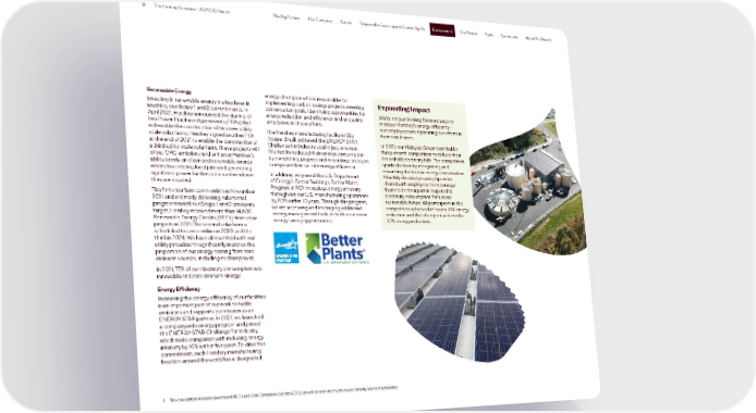 51 The Hershey Company | 2021 ESG Report Environment The Big Picture Our Company Cocoa Responsible Sourcing and Human Rights Environment Our People Youth Community About This Report Renewable Energy energy champion who is responsible for Investing in renewable energy is a key lever in implementing carbon savings projects, meeting Expanding Impact reaching our Scope 1 and 2 commitments. In conservation goals, identifying opportunities for We’re not just looking for more ways to April 2021, Hershey announced the signing of energy reduction and efficiency, and engaging increase Hershey’s energy efficiency — two Power Purchase Agreements (PPAs) that employees in these efforts. our employees are replicating our efforts in will enable the construction of two new utility- The Hershey manufacturing facility in São their own homes. scale solar farms. Hershey signed another PPA Roque, Brazil, achieved the ENERGY STAR at the end of 2021 to enable the construction of Challenge for Industry goal in just one year. In 2021, our Malaysia Green team held a a third utility-scale solar farm. These projects will The facility reduced their energy consumption three-month competition to reduce their offset GHG emissions and enhance Hershey’s by completing projects and executing strategies household electricity bills. The competition ability to rely on clean and renewable energy to improve their on-site energy efficiency. sparked action by recognizing and while also creating local jobs and generating rewarding the best in energy conservation. significant power for the communities where In addition, we joined the U.S. Department Monthly electricity-saving tips were they are situated. of Energy’s Better Buildings, Better Plants shared with employees to encourage The first solar farm came online in November Program in 2021 to reduce energy intensity them to do their part in responsible 2021 and is already delivering substantial throughout our U.S. manufacturing operations electricity consumption for a more progress toward our Scope 1 and 2 emissions by 20% within 10 years. Through this program, sustainable future. All participants in the target. Hershey received more than 14,600 we are accessing and leveraging additional competition achieved at least a 10% energy Renewable Energy Credits (RECs) from solar energy management tools to further uncover reduction and the champion achieved a projects in 2021. The second solar farm is energy saving opportunities. 32% energy reduction. scheduled to come online in 2022 and the third in 2024. We have also worked with our utility providers to significantly increase the proportion of our energy coming from zero emission sources, including nuclear power. In 2021, 77% of our electricity consumption was 1 renewable and zero emission energy. Energy Efficiency Increasing the energy efficiency of our facilities is an important part of our work to tackle emissions and supports our mission as an ENERGY STAR partner. In 2021, we launched a companywide energy program and joined the ENERGY STAR Challenge for Industry, which tasks companies with reducing energy intensity by 10% within five years. To drive this commitment, each Hershey manufacturing location around the world has a designated 1 This calculation includes purchased RECs and Zero-Emissions Credits (ZECs) as well as solar and hydro power directly sourced by facilities.