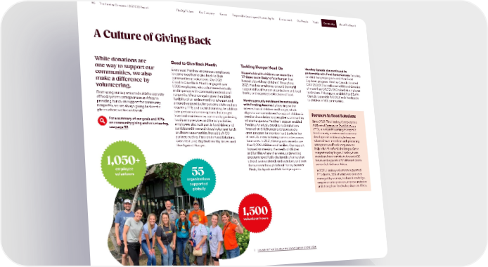 90 The Hershey Company | 2021 ESG Report The Big Picture Our Company Cocoa Responsible Sourcing and Human Rights Environment Our People Youth Community About This Report Community A Culture of Giving Back While donations are Good to Give Back Month Tackling Hunger Head On Hershey Canada also continued its one way to support our Households with children are more than partnership with Food Banks Canada, focusing Every year, Hershey encourages employees on child hunger programs and their Food communities, we also to come together to give back to their 1.7 times more likely to face hunger than Explorers program. Hershey Canada donated 1 communities as volunteers. Our 2021 households without children. Throughout CAD $50,000 as well as an additional donation make a difference by Good to Give Back Month engaged over 2021, Hershey employees around the world of more than CAD $5,000 raised via employee volunteering. 1,000 employees, who volunteered virtually supported local hunger organizations and food fundraisers. This support enabled Food Banks and in person with community and national banks, and organized collections of food. Canada to provide 150,000 fresh food packs From using our expertise to build the capacity nonprofits. We once again gave the added Hershey proudly continued its partnership to children in 180 communities. of food systems entrepreneurs in Africa to flexibility of an entire month to take part and with Feeding America by focusing on the providing hands-on support for community ensured we provided in-person activity options nonprofits, we are always giving back in the requiring PPE and social distancing. In addition intersection of children and hunger, which places where we live and work. to in-person volunteer options that ranged aligns to our commitment to support children in Partners in Food Solutions from trail maintenance, community gardening, need and our desire to strengthen communities For a summary of our goals and KPIs food pantry services and literacy activities, where we operate. Hershey’s support enabled Since 2015, The Hershey Company has on community giving and volunteering, employees also took part in food drives and Feeding America’s ongoing national efforts supported Partners in Food Solutions see page 92. participated in several virtual volunteer lunch focused on child hunger and sponsored a (PFS), a nonprofit working to improve and learn opportunities hosted by NGO grant program for member food banks in five food security, nutrition and economic partners such as Partners in Food Solutions, of our U.S. manufacturing communities across development in Africa by linking our Crisis Text Line, Big Brothers Big Sisters and four states. In 2021, these grants served more talented team members with promising Rise Against Hunger. than 9,000 children and families. Our support entrepreneurial food companies to focused on meeting the needs of children help solve their food challenges. Since and families where they were, underwriting our partnership began, Hershey team programs specifically designed at home, after members have contributed over 6,600 1,050+ school, over weekends and vacations, and over hours and supported 97 different clients employee the summer through School Pantry, Summer across Sub-Saharan Africa. volunteers 55 Meals, Backpack and Kids Café programs. In 2021, Hershey volunteers supported organizations PFS clients, 35% of which are owned or supported managed by women, to share knowledge, empower entrepreneurs, improve nutrition globally and strengthen food value chains in Africa. 1,500 volunteer hours 1 Household Food Security in the United States in 2020 | USDA