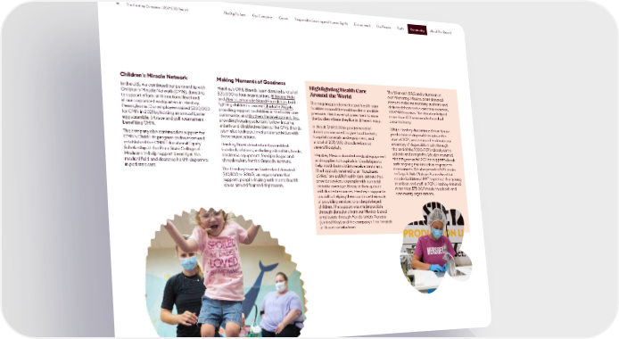 91 The Hershey Company | 2021 ESG Report The Big Picture Our Company Cocoa Responsible Sourcing and Human Rights Environment Our People Youth Community About This Report Community Children’s Miracle Network Making Moments of Goodness Highlighting Health Care The Women’s BRG and volunteers at In the U.S., we continued our partnership with Hershey’s ONE Brands team donated a total of Around the World our Monterrey, Mexico, plant donated Children’s Miracle Network (CMN), donating $25,000 to four organizations: B Strong Ride items to make mastectomy cushions and to support efforts at the national level and and Alex’s Lemonade Stand Foundation, both The ongoing pandemic has put health care delivered them to the cancer association, at our corporate headquarters in Hershey, fighting children’s cancer; Charlotte Angels, facilities around the world under incredible XTíXMíXNosotras. The donation helped Pennsylvania. Our employees raised $350,000 providing support to children in the foster care pressure. Hershey employees tried to ease more than 100 women who have had for CMN in 2021 by hosting an annual Easter community; and Brothers Redevelopment, Inc., the burden where they live in different ways. a mastectomy. egg scramble, 5K race and golf tournament providing housing solutions for low-income, In Brazil, $169,000 in pandemic relief While Hershey discontinued its in-house benefiting CMN. elderly and disabled residents. The ONE Brands donations was used to give food baskets, production of disposable masks at the The company also continued its support for team also took part in volunteer activities with hospital materials and equipment, and start of 2021, we continued to donate our CMN’s Child Life program endowment and these organizations. a total of 208,000 chocolate bars to inventory of disposable masks through established the CMN Educational Equity Hershey Brazil donated and assembled several hospitals. the end of the 2020-2021 school year to Scholarship at the Penn State College of hundreds of items, including school kits, books, Hershey Mexico donated medical equipment schools and nonprofits. We also restarted Medicine to help support diversity in the electronic equipment, food packages and and supplies to hospitals in Guadalajara to the program in fall 2021 to support schools medical field and decrease health disparities chocolate kits, for the Granada Institute. help youth burn victims receive treatment. with ongoing mask needs in response to in pediatric care. The Hershey team in Switzerland donated The hospitals, referred to as “hospitales new variants. We also provided N95 masks $10,800 to SGAD, an organization that civiles,” are public health care centers that to Boys & Girls Clubs in Puerto Rico that supports people dealing with mental health provide services to people with no social needed additional PPE to protect their young issues around fear and depression. security coverage. Because they operate members and staff. In 2021, Hershey donated with limited resources, Hershey’s support is more than 575,000 masks to schools and crucial to helping them continue their work community organizations. of providing services to underprivileged children. The support was made possible through donations from our Mexico-based employees through Fondo Unido Noreste (United Way) and the company’s 1-to-1 match of those contributions.