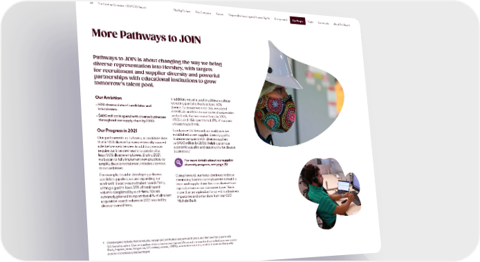 69 The Hershey Company | 2021 ESG Report The Big Picture Our Company Cocoa Responsible Sourcing and Human Rights Environment Our People Youth Community About This Report Our People More Pathways to JOIN Pathways to JOIN is about changing the way we bring diverse representation into Hershey, with targets for recruitment and supplier diversity and powerful partnerships with educational institutions to grow tomorrow’s talent pool. Our Ambition In addition, we set a goal to achieve a college recruiting portfolio that is at least 50% • 50% diverse slate of candidates and diverse. To ensure we meet this, we added interviewers. 23 HBCUs and HSIs to our roster of universities • $400 million in spend with diverse businesses and schools that we recruit from. In 2021, throughout our supply chain by 2030. HBCUs and HSIs constituted 47% of our core universities/schools. Our Progress in 2021 To advance DEI beyond our workforce, we established a new supplier diversity goal to Our goal commits us to having a candidate slate increase our spend with diverse suppliers that is 50% diverse for every externally sourced to $400 million by 2030, helping promote role before we interview. In addition, we now economic equality and opportunity for diverse require our interview teams to consist of at 1 businesses. least 50% diverse employees. During 2021, we began to fully implement new practices to For more details about our supplier amplify diverse recruitment initiatives to meet diversity program, see page 70. these ambitions. For example, to aid in developing a diverse Going forward, our focus continues to be on candidate pipeline, we are expanding our eliminating barriers to employment to build a work with diverse-owned talent search firms, team and supply chain that is as diverse from setting a goal to have 30% of total search top to bottom as our consumer base. This is volume completed by such firms. We are more than an aspiration for us — it is a business extremely pleased to report that 41% of all talent imperative and a mandate from our CEO acquisition search volume in 2021 was led by Michele Buck. diverse-owned firms. 1 Diverse spend includes formal industry-recognized certification and self-certification, and Tier 1 and Tier 2 spend with U.S.-based suppliers. Diverse suppliers refers to businesses that are 51% owned, managed and controlled by women and/or Black, Hispanic, Asian, Indigenous, U.S. military veteran, LGBTQ+ and disabled persons, or other individuals that qualify as socio-economically disadvantaged.