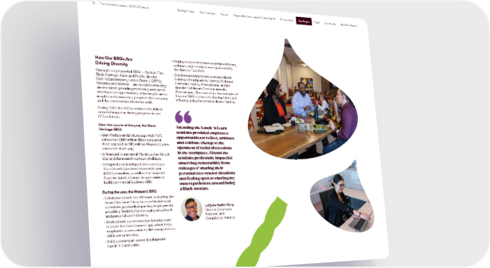 72 The Hershey Company | 2021 ESG Report The Big Picture Our Company Cocoa Responsible Sourcing and Human Rights Environment Our People Youth Community About This Report Our People How Our BRGs Are • Employees benefited from monthly well-being Driving Diversity webinars, eight of which were sponsored by the Abilities First BRG. Our eight employee-led BRGs — Abilities First, • Gender neutral restrooms were installed in Black Heritage, Asian and Pacific Islander, Hershey’s headquarters, Hershey Technical GenH (Generations), Latino, Prism (LGBTQ), Center in Hershey, Pennsylvania, and the Veterans and Women — are crucial to attracting Annville Fulfillment Center in Annville, diverse talent, providing mentoring and career Pennsylvania,. These are only a few examples of development opportunities, delivering business how our BRGs continue to develop talent and insights and connecting people to the company influence policy for a more inclusive Hershey. and the communities where we work. During 2021, the BRGs continued to deliver outsized impact in driving progress on our DEI ambitions. Over the course of the year, the Black Attending the Lunch ’n Learn Heritage BRG: sessions provided employees • Identified potential share gaps with POC opportunities to reflect, embrace consumers ($40 million Black consumer and cultivate change to the share gap and an $80 million Hispanic/Latino consumer share gap). openness of racial discussions • Influenced incremental Martin Luther King Jr. in the workplace. I found the Day and Juneteenth company holidays. sessions profoundly impactful • Designed and developed the Investing In observing vulnerability from Your Growth Speakers Series with over colleagues’ sharing their 4,000 attendees, as well as the Financial personal race related situations Acumen Lunch ‘n Learn six-part series to and feeling open to sharing my build commercial business skills. own experiences around being During the year, the Women’s BRG: a Black woman. • Collaborated with the HR team to develop the SmartFlex Time Policy for more flexible work schedules, positively impacting employees by LaQuita Smith-Gary, providing flexibility for managing virtual work Director, Employee and personal commitments. Relations and • Worked with our Information Security team Compliance, Hershey to share the Care Connect app, which helps employees access services like transportation, childcare or tutoring. • Held a seven-part career development Lunch ‘n Learn series.