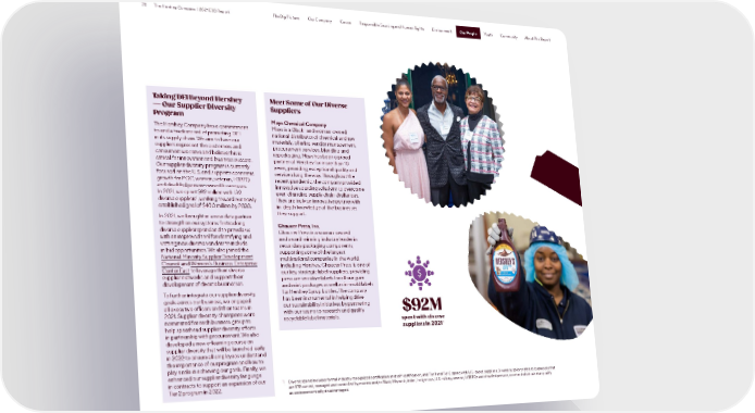 70 The Hershey Company | 2021 ESG Report The Big Picture Our Company Cocoa Responsible Sourcing and Human Rights Environment Our People Youth Community About This Report Our People Taking DEI Beyond Hershey Meet Some of Our Diverse — Our Supplier Diversity Suppliers Program Mays Chemical Company The Hershey Company has a commitment Mays is a Black- and woman-owned to and a track record of promoting DEI national distributor of chemical and raw in its supply chain. We aim to have our materials, offering vendor management, suppliers represent the customers and procurement services, blending and consumers we serve and believe this is repackaging. Mays has been a proud critical for innovation and business success. partner of Hershey for more than 10 Our supplier diversity program is currently years, providing exceptional quality and focused on the U.S. and supports economic service along the way. Throughout the growth for POC, women, veteran, LGBTQ recent pandemic, the company provided and disabled person-owned businesses. innovative sourcing solutions to overcome In 2021, we spent $92 million with 139 ever-changing supply chain challenges. 1 diverse suppliers, working toward our newly They are truly an innovative partner with established goal of $400 million by 2030. in-depth knowledge of the businesses In 2021, we brought in a new data partner they support. to strengthen our systems for tracking Chaucer Press, Inc. diverse supplier spend and to provide us Chaucer Press is a woman-owned with an improved tool for identifying and and award-winning industry leader in vetting new diverse vendors to include secondary packaging components, in bid opportunities. We also joined the supporting some of the largest National Minority Supplier Development multinational companies in the world, Council and Women’s Business Enterprise including Hershey. Chaucer Press is one of Center East to leverage their diverse our key strategic label suppliers, providing supplier networks and support their pressure sensitive labels for all our gum development of diverse businesses. and mint packages as well as in-mold labels To further integrate our supplier diversity for Hershey Syrup bottles. The company goals across our business, we engaged has been instrumental in helping drive all executive officers and their teams in our sustainability initiatives by partnering 2021. Supplier diversity champions were with our teams to research and qualify $92M nominated for each business group to recyclable label materials. spent with diverse help spearhead supplier diversity efforts 1 in partnership with procurement. We also suppliers in 2021 developed a new e-learning course on supplier diversity that will be launched early in 2022 to ensure all employees understand the importance of our program and how to play a role in achieving our goals. Finally, we enhanced our supplier diversity language in contracts to support an expansion of our 1 Diverse spend includes formal industry-recognized certification and self-certification, and Tier 1 and Tier 2 spend with U.S.-based suppliers. Diverse suppliers refers to businesses that Tier 2 program in 2022. are 51% owned, managed and controlled by women and/or Black, Hispanic, Asian, Indigenous, U.S. military veteran, LGBTQ+ and disabled persons, or other individuals that qualify as socioeconomically disadvantaged.