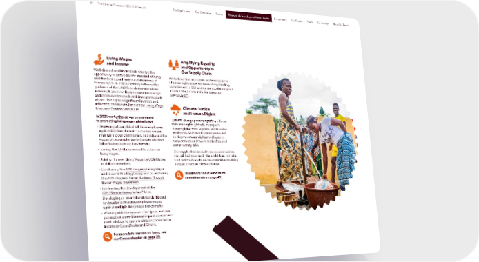 37 The Hershey Company | 2021 ESG Report Responsible Sourcing and Human Rights The Big Picture Our Company Cocoa Responsible Sourcing and Human Rights Environment Our People Youth Community About This Report Living Wages Amplifying Equality and Income and Opportunity in We believe that all individuals deserve the Our Supply Chain opportunity to earn a decent standard of living We believe that, at its core, systemic racism is and that being paid fairly is a cornerstone of a human rights issue. We have a longstanding human rights. In 2020, Hershey followed the commitment to DEI and we are accelerating our guidance of the UNGPs to determine where efforts to be a more inclusive company individuals are most likely to experience wage (see page 67). and income-related vulnerabilities, particularly where Hershey has significant leverage and influence. This resulted in our new Living Wage Climate Justice & Income Position Statement. and Human Rights In 2021, we furthered our commitment Climate change poses a significant threat to promoting living wages globally by: to human rights globally. Its impacts • Reviewing all our global full-time employees disrupt global food supplies and threaten against BSR benchmarks to confirm we are livelihoods. Vulnerable communities will maintaining our commitment and adjusted the be disproportionately harmed by rising wages of two employees in Canada who had temperatures and the related safety and fallen below updated benchmarks. water scarcity risks. • Joining the IDH business call to action on Our supply chain includes many communities living wages. that will be impacted if the world does not take • Joining the new Living Wage for US initiative bold action. As such, we are committed to doing as affiliate members. our part to act on climate change. • Co-chairing the AIM-Progress Living Wage and Income Working Group and co-authoring Read more about our climate the AIM-Progress Better Business Through commitments on page 49. Better Wages Statement. • Co-funding the development of the IDH Manufacturing Salary Matrix. • Developing an internal analytics dashboard to visualize all Hershey employee wages against multiple living wage benchmarks • Working with the research firm Ipsos, we have put in place a new biannual impact assessment methodology to capture data on cocoa farmer income in Cote d’Ivoire and Ghana. For more information on Ipsos, see our Cocoa chapter on page 28.